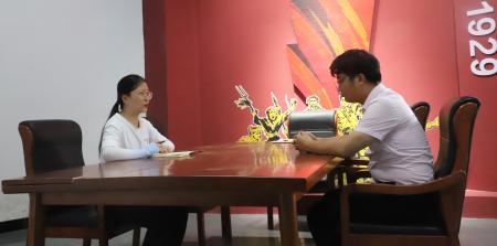 图为新葡京 统计学院学子在九龙山革命斗争陈列馆对九龙山乡干部曾锋进行采访。