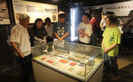 图为新葡京 统计学院学子在沙陂村红色遗址观看党课。
