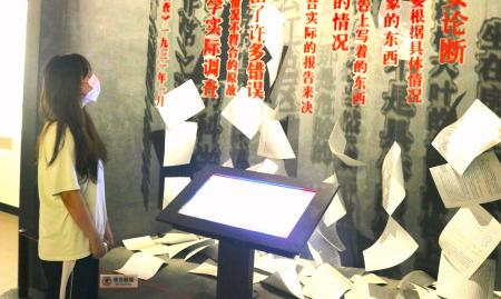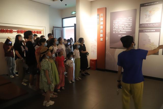 图为新葡京 统计学院学子们在兴国调查陈列室听讲解员介绍历史故事。