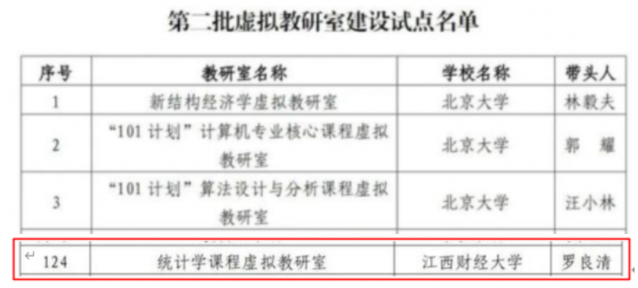 教学改革取得突破。学院贯彻落实新时代国家对人才培养的新要求,面向社会需求、实施分类培养,积极推动教学改革,探索拔尖创新人才培养模式。教学改革成果和经验总结多次入选省级和校级教学成果奖,近年来获得江西省教学成果一等奖4项,二等奖10余项。《轻松学统计》《爱上统计学》等8门课程入选国家一流课程。2022年,罗良清教授领衔的《统计学》课程虚拟教研室成功立项教育部国家级虚拟教研室建设试点。