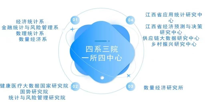 学院下设“四系三院一所四中心”,即经济统计系、数据科学系、数理统计系和数量经济系,健康医疗大数据国家研究院、国势研究院、统计与风险管理研究院、数量经济研究所,以及江西省应用统计研究中心、江西省经济预测与决策研究中心、供应链大数据研究中心和乡村振兴研究中心。2023年获批2个省级院士工作站。