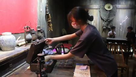 图为新葡京 统计学院学子在九龙山革命斗争陈列馆进行沉浸式红色剧本演绎。
