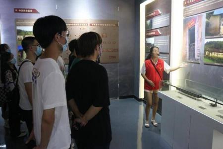 图为新葡京 统计学院学子在九龙山革命斗争陈列馆听讲解员介绍花桥支部旧址的故事。