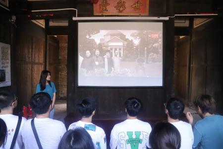 图为新葡京 统计学院学子在沙陂村红色遗址观看党课。
