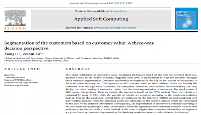 近日,新葡京 李翔老师与四川大学徐泽水教授合作的研究论文《Segmentation of the customers based on customer value:A three-way decision perspective》在计算机科学国际一流期刊Applied Soft Computing 2024年第167卷正式发刊。